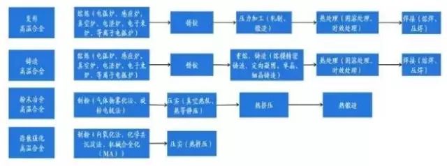高温合金产品以非标准化为主,因此生产工艺较为复杂,但基本可以可分为三个步骤:熔炼、铸造和热加工,粉末冶金工业则将铸造工艺替代为热压。
