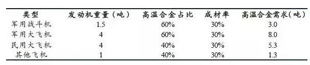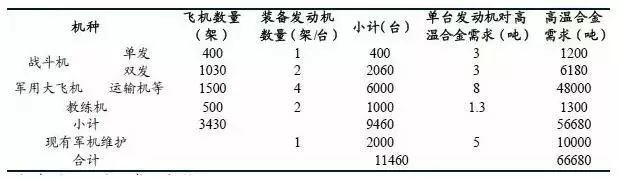另外,现有军机的维护和修理折算成发动机所需数量为2000台,对应的高温合金需求量达到1万吨左右。因此军用领域对高温合金的需求将达到6.7万吨。