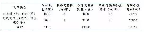 由于不同机型的发动机所需的高温合金占比不同,根据测算,未来二十年全球民航各类型新机航空发动机,对高温合金的总需求为42.7 万吨。